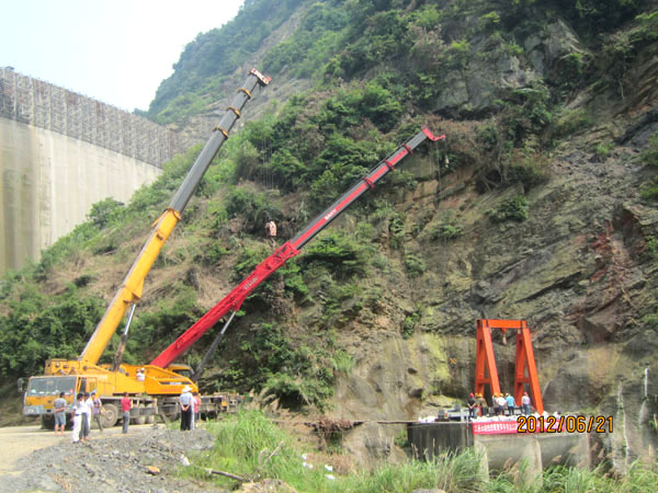 我司施工人員進行導流隧洞封堵閘門下閘作業