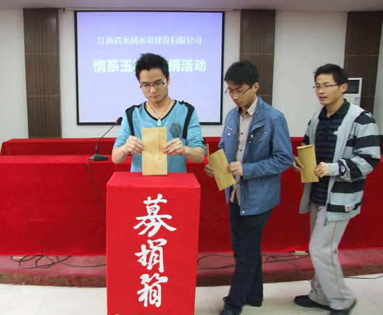 2010年4月14日,青海省玉樹縣發(fā)生兩次地震,最高震級7.1級,造成了當?shù)鼐薮蟮娜松韨龊拓敭a(chǎn)損失,“玉樹地震”牽動著億萬人民的心,也牽動著我司所有員工的心!公司在全司范圍內積極開展“情系玉樹募捐活動”,4月26日,我公司南昌市機關總部首先開展了“情系玉樹募捐活動”,公司中層以上管理人員和員工踴躍參與募捐活動,紛紛獻上自己的一份愛心,體現(xiàn)出江西水總人的社會責任感!同時,各分公司、國內外施工項目部也在開展此項活動,預計此項活動將募得資金3萬余元。