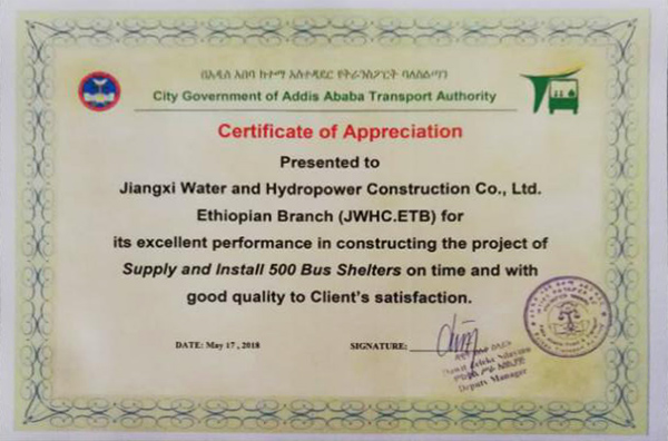 近日,埃塞有限公司收到亞的斯亞貝巴市交通局頒發的感謝證書,表彰公司在承建亞的斯亞貝巴市500套公交候車亭供貨與安裝項目上表現優異。