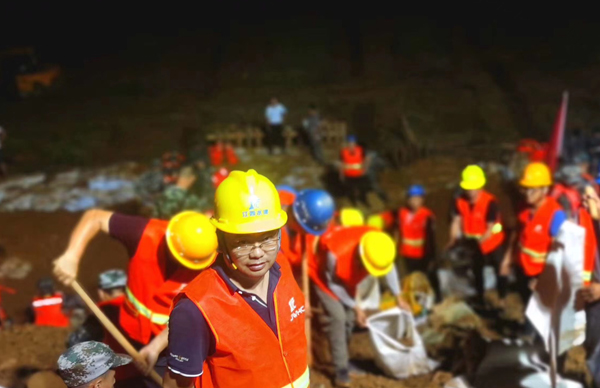 彭燦華是第一時間帶領抗洪搶險隊員趕赴現場與洪水戰斗的先遣軍。他連夜指導施工人員開展搶險工作,天黑路滑,他幾次摔倒在泥濘中,眼鏡上沾滿了泥點,渾身早已被泥水覆蓋,即便這樣,他還是一邊了解汛情水情,一邊指揮搶險,一邊將一線汛情匯報給公司,一邊頂著傾盆大雨加入到搶險的隊伍中,裝袋抬土,和搶險施的隊伍們奮戰在一起。